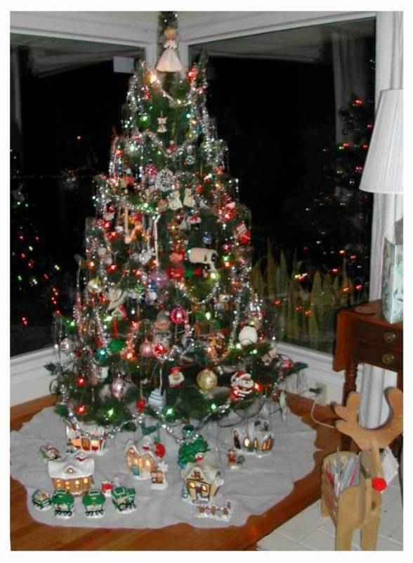 Our Christmas tree and village. See Annie under there?