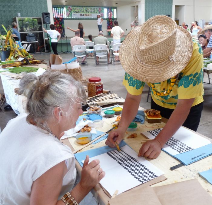 Stamping a tapa design. They used ginger root as the stamp.