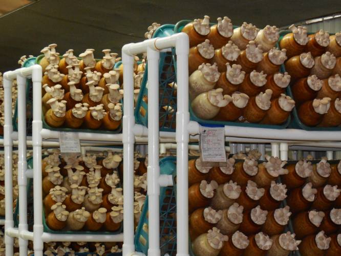 Mushrooms growing in their plastic jars