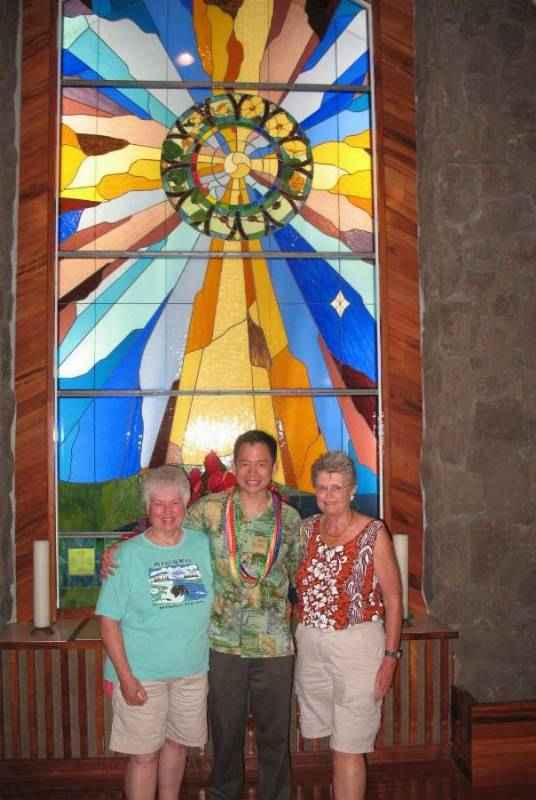 Sandy, Reverend Jonipher Kwong, and Pat after Sunday services in Oahu.