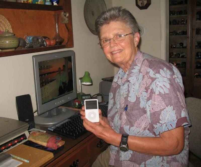 Pat shows off her new iPod -- she uses it to put the sermons on the church website.