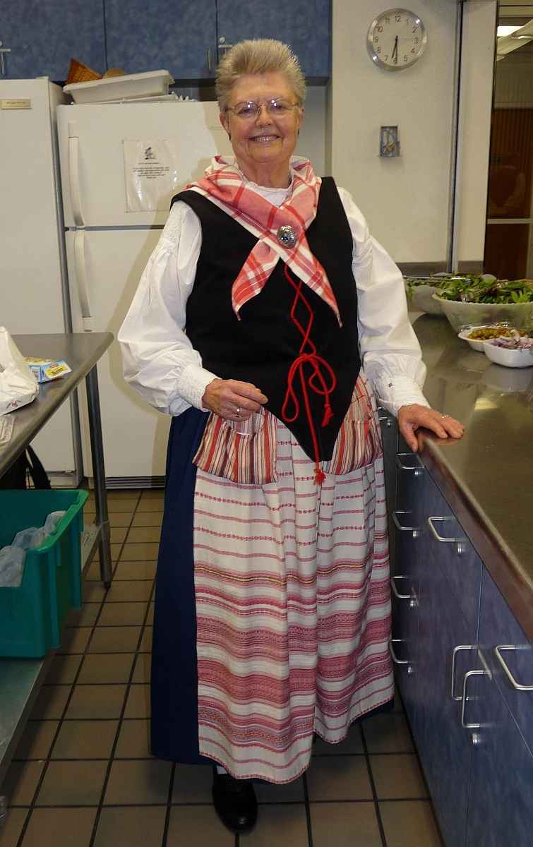 Pat, in her authentic Swedish costume, making pea soup for the VASA group.