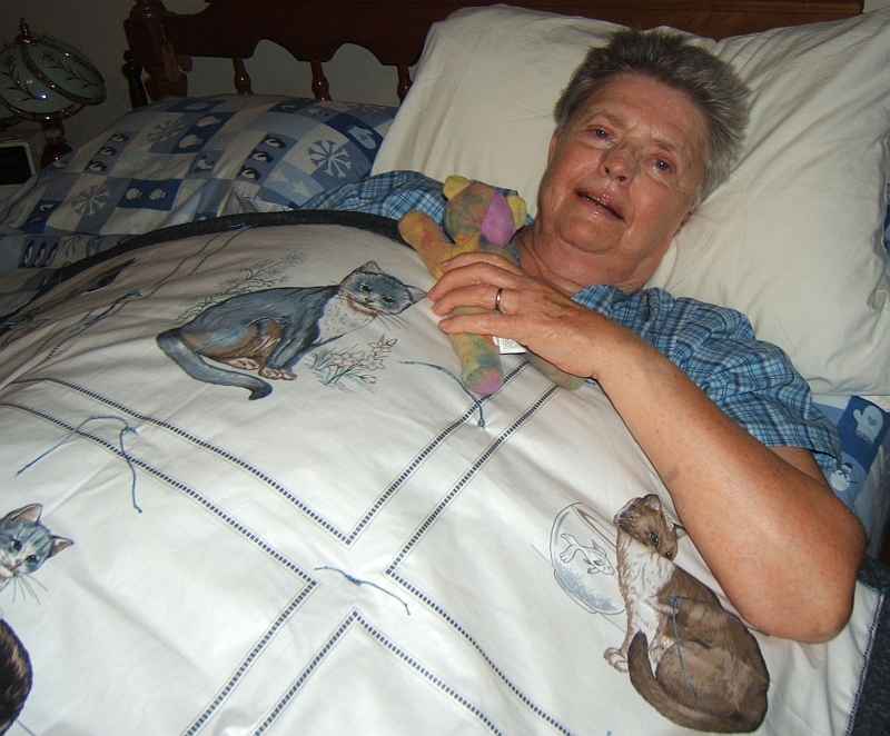 Pat holds her Teddy Bear while covered with her prayer quilt.