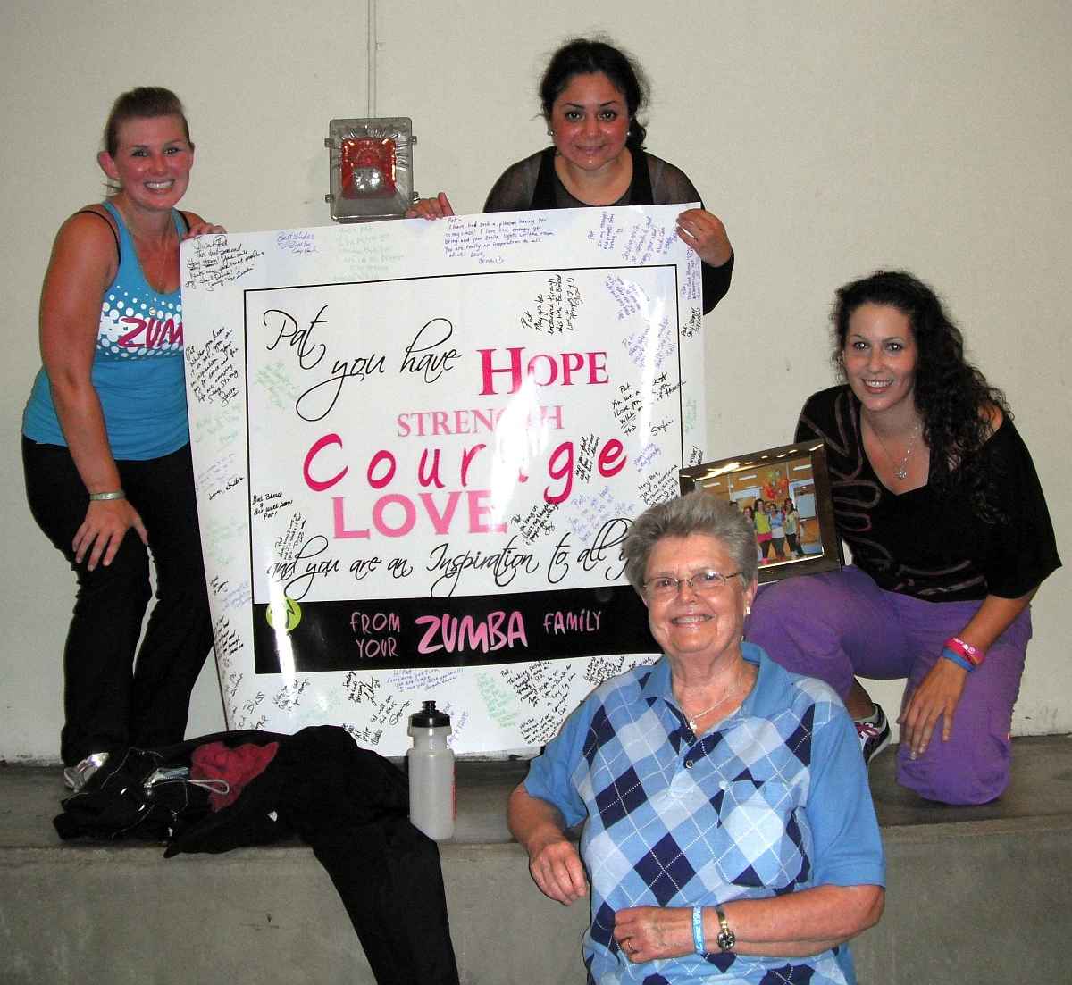 Orna, teacher on the far right, presents Pat with a poster from the Zumba class members.
